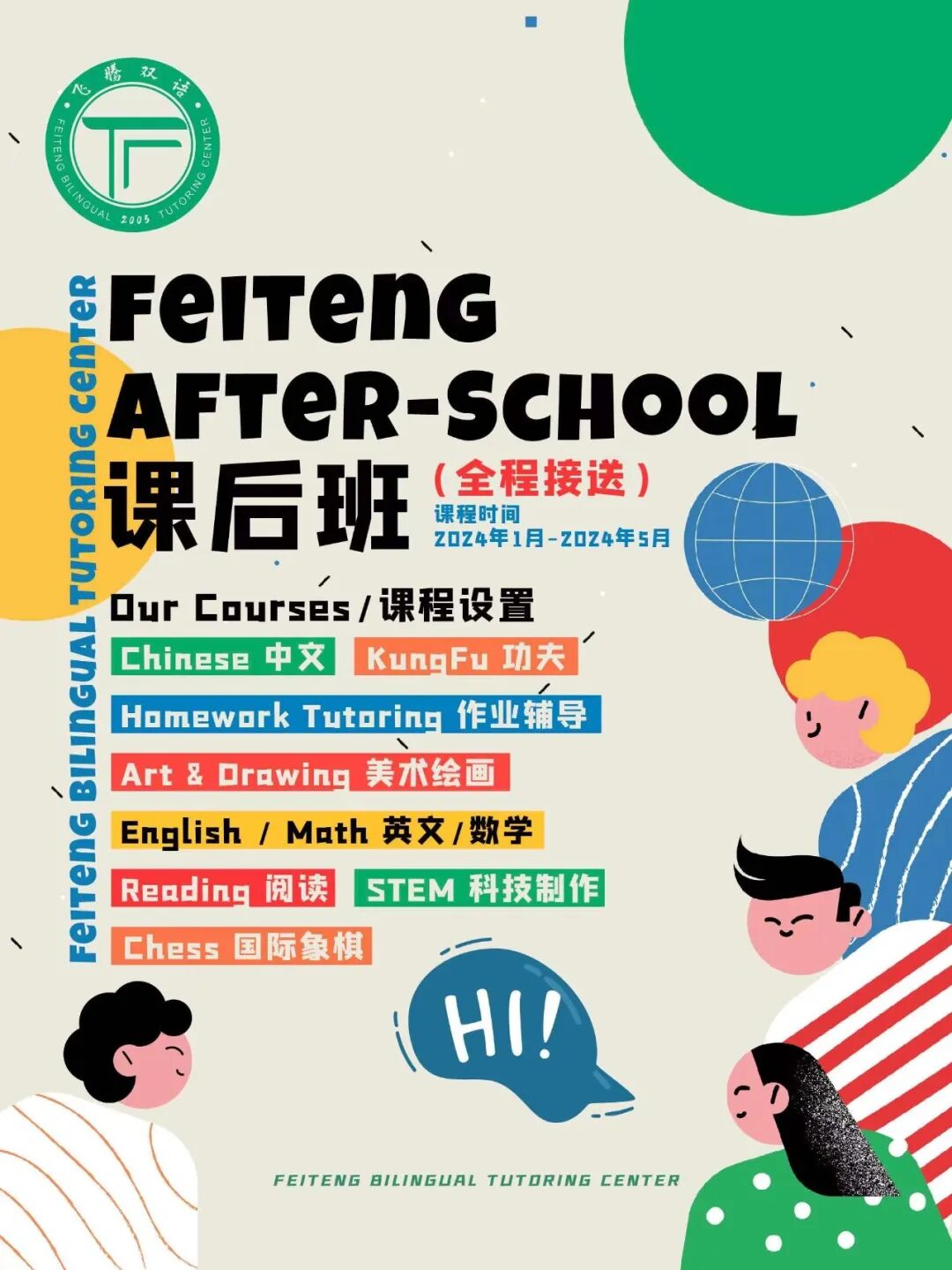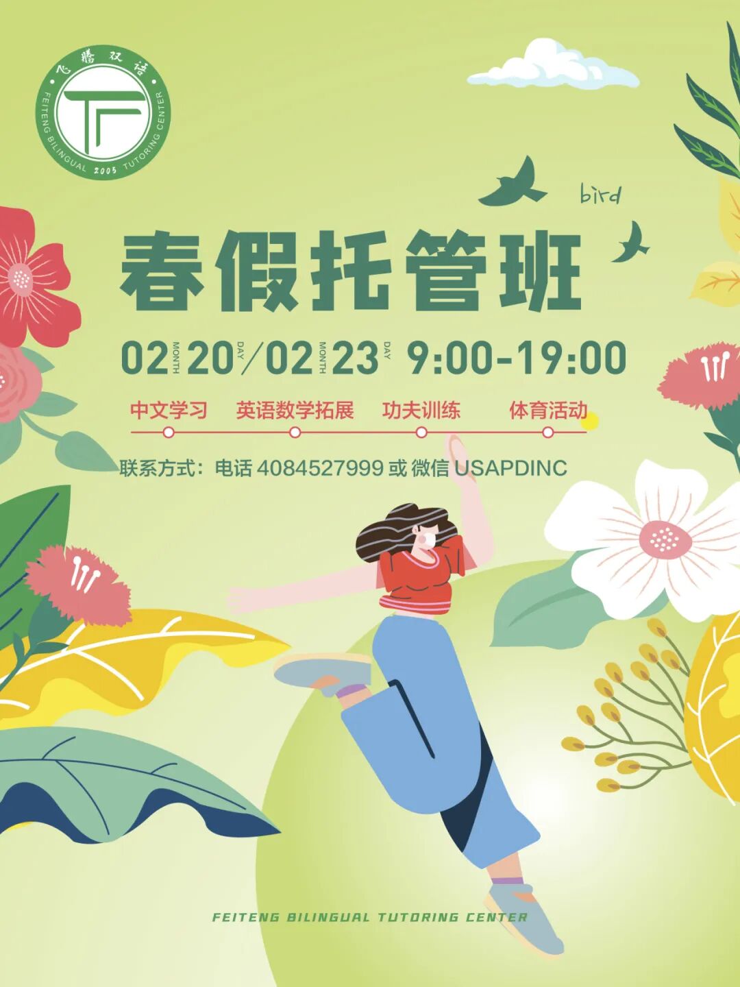 飞腾双语学校 | 春假全天托管Issuing time:2024-02-06 08:09 在这个温暖的春日,Feiteng After-School为您的宝贝们打造了完美的春假时光! ![]() 灵活时间安排:我们的课程从上午9点开始,一直持续到晚上7点,充分适应了孩子们在家的放假时光。家长们可以根据自己的时间表,自由灵活选择仅需要上午课程或者仅需要下午课程。 ![]() ![]() 全方位课程选择:除了中文和功夫课程,我们还提供数学、英语、舞蹈等多样化的兴趣课程,让宝贝们在学习中快乐成长。 ![]() ![]() 让您的孩子在飞腾双语温馨的学堂氛围中度过春假,无论是增进学科知识,锤炼体能,还是培养兴趣爱好,都将是一段难忘而有意义的时光! ![]() ![]() 欢迎致电4084527999或扫描二维码(腾飞小助手微信),了解更多详情并报名参与! ![]() Feiteng After-School期待与您的宝贝一同度过一个充实而愉快的春假! 「飞腾双语学校」 我们的课程 ![]() 中文课程-以人为本 ▪️中国教育部统编的小学语文教材,简称部编版、部编教材或统编教材。教材封面认准“教育部审定”字样。 ![]() ▪️2012年正式启动编写,历时五年,于2017年完成编写、评审和试用,在同年秋季正式开始在中国大陆小学一年级课堂使用。 △孩子们练字 △孩子们练书法 功夫训练-文武双全 深受孩子和家长们喜爱的功夫课,是我们学校引以为傲的特色课程之一,该课程的教师队伍和教学资源都由隶属于同一教育集团旗下的飞师傅功夫学院提供,专业性在湾区功夫课程方面首屈一指。 △定期举办功夫考带 飞师傅功夫将博大精深的中华武术精粹提炼:以白、黄、绿、紫、蓝、褐、红、黑带等十五个级别逐步培养学员,让他们从武术小白成长为英姿飒爽的功夫少年! △课堂欢乐时光 飞师傅功夫学院始终坚持中国武术的“未曾学艺先学礼,未曾习武先习德”的武德教育传统,把集中精力、平衡、尊重、律己、感恩、仁爱、执着、谦逊、勇敢等品质培养放在第一位。在此基础上,运用现代科学的教学方法,寓教于乐,将武术技能的学习与运动游戏等解压方式相结合,让孩子们在一个更为愉悦的环境中进行功夫学习。 △比赛获奖 飞腾双语 AFTER-SCHOOL 欢迎来自各国不同文化背景的孩子加入 SAN JOSE校区 学校地址: 1715 Lundy Ave, Suite 128, San Jose, CA 95131 ☎️电话号码: (408)452-7999 (Mon-Fri 10:00-19:00) Wechat ID: USAPDINC ![]() FREMONT校区 学校地址: 37365 - 37371 Fremont Blvd, Fremont, CA 94536 ☎️电话号码: (510)979-9886 (Mon-Fri 10:00-19:00) Wechat ID: FeitengFremont ![]() Website: ustfg.com Prev功夫之夜 | 2024盛宴回顾