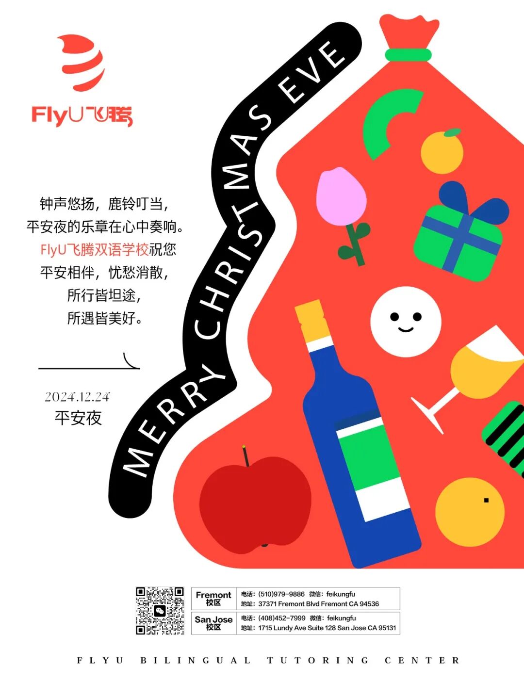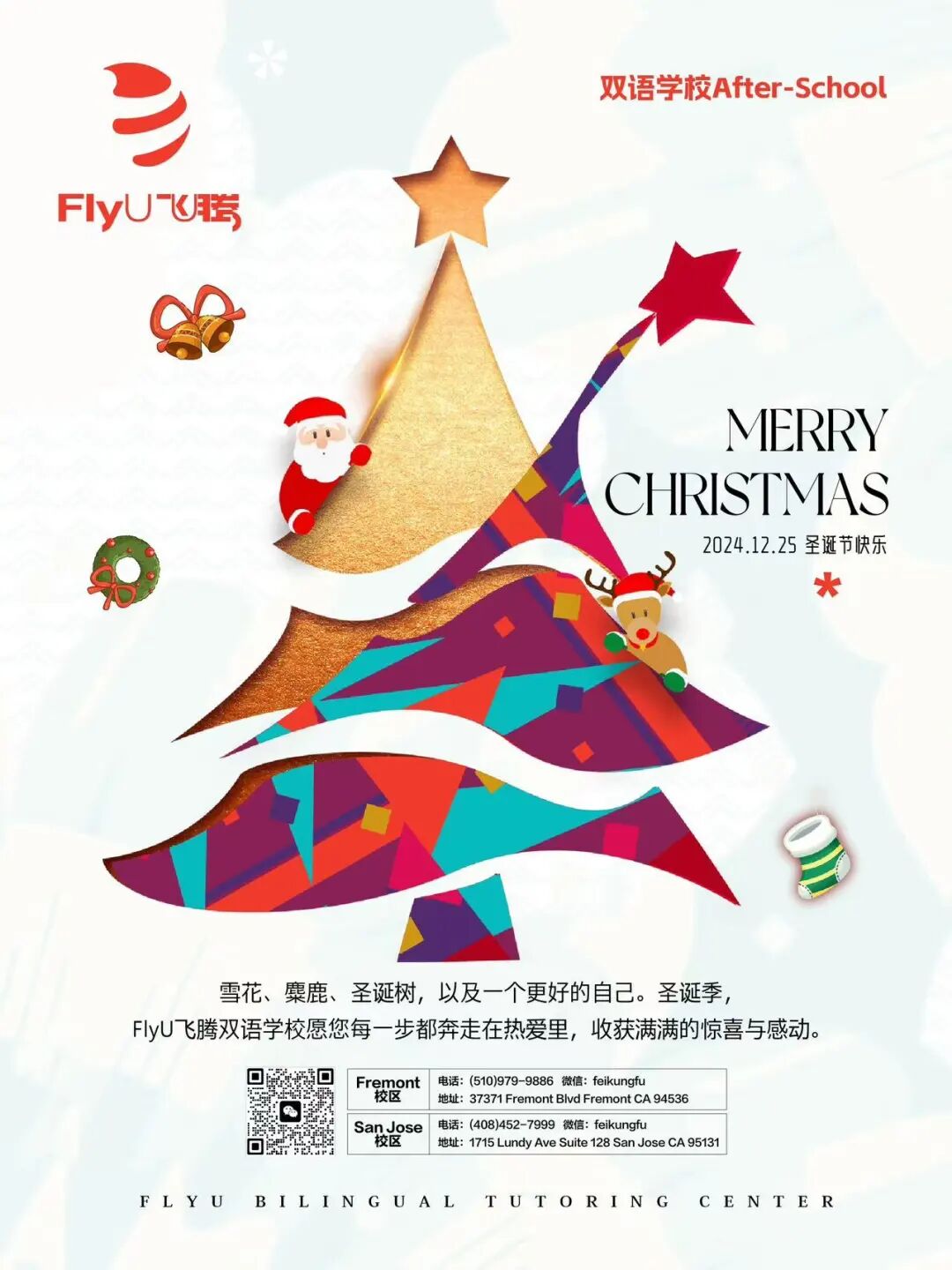 雪花飘飘,驯鹿铃响,圣诞的脚步悄悄临近。FlyU飞腾双语学校愿您的生活如圣诞树般多彩,充满惊喜和欢乐。愿圣诞老人为您送来满满的幸福,让您的梦想都能成真。愿您与家人朋友共度美好时光,笑声回荡在每一个角落。愿您的心中永远充满爱与温暖,祝您圣诞快乐,岁岁平安!