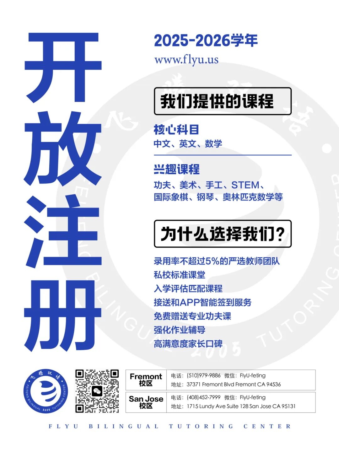 FlyU 飞腾丨2025飞腾双校区年终演出回顾Issuing time:2026-01-08 17:38 年终总结 时光匆匆,2025年已悄然接近尾声,飞腾双语学校一年一度的年终汇报演出也圆满落下帷幕。在这场充满欢乐与感动的盛会上,孩子们用才华与热情点亮了舞台,为我们带来了一场难忘的艺术盛宴。 ![]() ![]() 【全体温馨大合照】 本次年终汇报演出共有21个精彩节目,涵盖诗歌、舞蹈、音乐、功夫表演等多种形式,每个节目都独具匠心,展现了学校多元文化和凝聚力。 ![]() 【完整节目单】 演出在充满活力的开场主持中拉开帷幕。主持人们面带灿烂笑容,用掷地有声的声音向每一位观众致以诚挚问候,瞬间点燃了现场气氛。 ![]() 在激昂的音乐声中,功夫表演《武源之启蒙》震撼登场。舞棍、舞龙舞狮、舞刀、川剧变脸,精彩演出引来阵阵喝彩,演绎着武术的的博大精深和丰富的文化内涵。 ![]() ![]() ![]() ![]() 手势歌《读唐诗》,校区的孩子们用手势舞重新演绎!当古典诗词遇上灵动肢体,文字不再只是纸上的墨痕,而是化作指尖的韵律、眼中的星河。 ![]() 当这些“魔鬼”绕口令遇上K4班的小机灵鬼,会碰撞出怎样的火花?K4班的萌娃们,用一场超燃的《绕口令串烧》挑战你的舌头极限! ![]() ![]() 当校区的孩子们用清澈的嗓音诵读《苏轼诗词联诵》,千年前的豁达与智慧,仿佛化作一缕清风,拂过每个人的心田。 ![]() 萌娃版《爱的加减法》上线!K1&K2B用舞蹈算出100%的甜~ ![]() ![]() ![]() 当黑白琴键遇上稚嫩的小手,当四首优美旋律从琴凳上的小身影中流淌而出,我们知道——这是属于音乐小天使们的闪耀时刻! ![]() ![]() ![]() ![]() ![]() 听San Jose校区K2A班萌娃们用稚嫩童声朗诵《我只是小孩,我不是天才》,原来最动人的成长,是允许自己慢慢开花。 ![]() Fremont校区萌娃们用《听我说谢谢你》唱响感恩之心,稚嫩歌声里藏着最纯真的爱,快为这群小天使鼓掌吧! ![]() ![]() 萌娃版「火箭少女101」炸场!K3班女生用啦啦操点燃全场~ ![]() ![]() ![]() 年度爆笑预警!「三句半天团」又双叒叕来炸场啦~ "锣鼓一敲响连天,五个帅哥站台前!"你就知道——今晚的快乐,已经被他们承包了! ![]() 当San Jose校区K6的孩子们唱响《朋友我的朋友》,稚嫩歌声里藏着校园最珍贵的礼物——那些一起笑闹、成长的纯真友谊。 ![]() 当K2A萌娃们唱响《古诗串烧》,千年诗韵在童声里苏醒,山水情意化作最生动的成长课堂。 ![]() ![]() 当童声遇见音符,学习变成欢乐派对——Fremont校区小朋友们用《Do-Re-Mi》唱响英文启蒙的无限可能! ![]() 当K1萌娃与K2B小勇士携手演绎《我是一条小鱼》,诗朗诵与合唱交织成海浪般的欢乐,邀你见证这份纯真的勇敢启航! ![]() Fremont校区6位女孩以《声声慢》唱响中国风,悠扬旋律如小桥流水,专属MV即将揭幕,邀你共赴这场诗意邂逅! ![]() ![]() 炸场预警!K10×K6《Ditto》街舞首秀,这波节奏我先跟为敬! 当K10的酷盖遇上K6的萌新,当《Ditto》的鼓点撞上街舞的律动——即将诞生新一代"节奏王者"! ![]() ![]() ![]() 当童真遇见功夫,Fremont校区萌娃们用《功夫梦》演绎刚柔并济的东方美学——掌声欢迎这场热血与文化的碰撞! ![]() ![]() 当K6与K10学子同台串烧现代诗,文字化作浪花翻涌,邀你潜入语言的深海,共赴一场跨越年龄的诗意共鸣! ![]() ![]() Fremont校区学子炸裂演绎《We Will Rock You》,鼓点与欢呼交织成能量风暴——准备好被这股青春摇滚浪潮席卷了吗? ![]() 当K3与K4萌娃唱响《最好的未来》,纯真笑容化作星辰,照亮无限可能——这场关于梦想的童声预言,邀你共同见证! ![]() ![]() ![]() 当全体孩子齐声唱响《纸飞机》,稚嫩歌声化作翅膀,载着梦想飞向蓝天——这场大合唱是童年最响亮的宣言! ![]() ![]() 在高潮迭起中,21个节目不知不觉走到了尾声,这场圆满的演出,不仅是对小学员们平日勤奋学习的见证,也凝聚了家长和老师们在台前幕后的辛勤付出。这场年终汇演如同一面镜子,映照出孩子们一年来的成长足迹。他们在舞台上自信绽放,用才华书写青春篇章。 ![]() ![]() ![]() 【精彩的台前幕后,感谢大家】 学校多元文化的实践,本质上是培养未来全球公民的基石。通过节目中的文化元素,学生不仅学习知识,更在情感上建立归属感,让每个学生都能在尊重与包容中,找到属于自己的声音。 ![]() 我们期待在新的一年里,让学校骄傲的孩子们能继续勇敢追梦,在知识的海洋中乘风破浪;2025年的舞台虽已落幕,但梦想的征程永不止步。 FlyU飞腾期待和学生们一起携手,创造更多美好的成长瞬间! ![]() 【完美ending】 ![]() ![]() 2025年秋季学位申请限定开放 欢迎来自各国不同文化背景的孩子加入 ![]() ![]() SAN JOSE校区 📌学校地址: 1715 Lundy Ave, Suite 128, San Jose, CA 95131 ☎️电话号码: (408)452-7999 (Mon-Fri 10:00-19:00) 🍃Wechat ID: FlyU-feting ![]() FREMONT校区 📌学校地址: 37371 Fremont Blvd, Fremont, CA 94536 ☎️电话号码: (510)979-9886 (Mon-Fri 10:00-19:00) 🍃Wechat ID: FlyU-feting ![]() 💻Website: www.flyu.us ![]() ![]() 【FlyU飞腾舞龙舞狮&功夫表演】承接各类开业庆典、节日庆典、年终盛宴、婚礼现场…… 【FlyU飞腾中文课】部编版小学语文国飞腾中文教材 湾区课后班 【FlyU飞腾数学课】飞腾After-School[数学进阶辅导课程] 它来啦! 【FlyU飞腾飞师傅功夫】湾区功夫课|我们是专业认真的—飞腾课后学校 【FlyU飞腾足球训练营】湾区足球爱好者福利来袭——各年龄段均可参与! 【FlyU飞腾国际